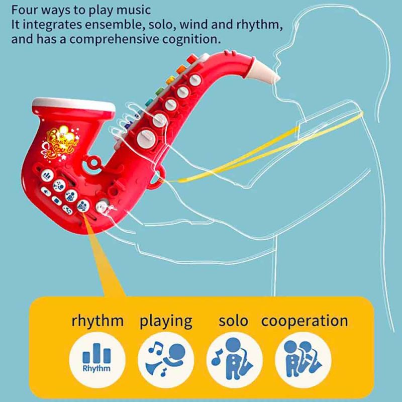 Детски саксофон със звук и светлини е идеалната играчка за малките музиканти и любители на музиката. Този интерактивен инструмент предоставя на децата възможност да се запознаят със света на музиката, като развиват своето слухово и визуално възприятие, както и моторните си умения.