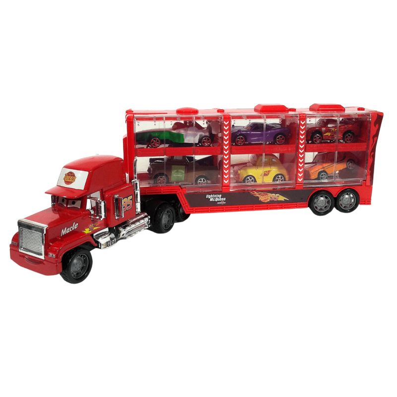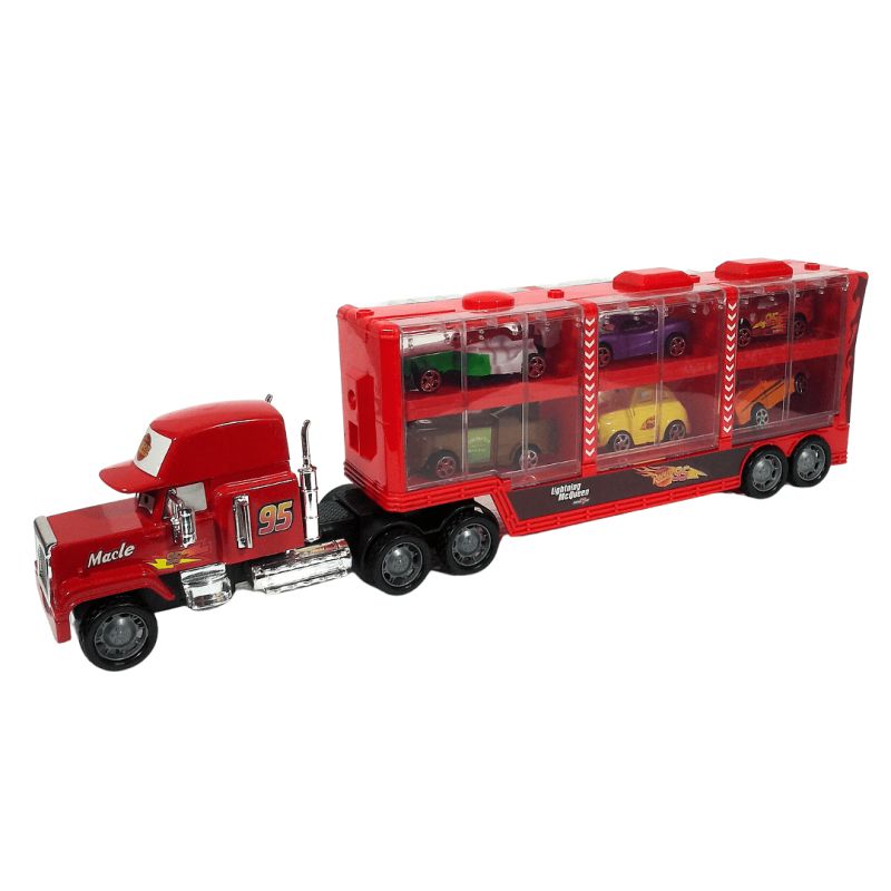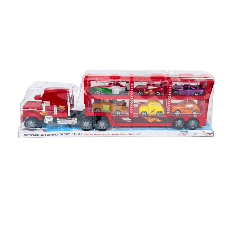 Пренесете се в света на Светкавицата Маккуин с този впечатляващ камион автовоз, вдъхновен от емблематичната анимация Disney Cars. Камионът е изработен от здрав материал и разполага с просторен контейнер с прозрачни капаци за съхранение и пренасяне на 6 колички в различни цветове и дизайни.