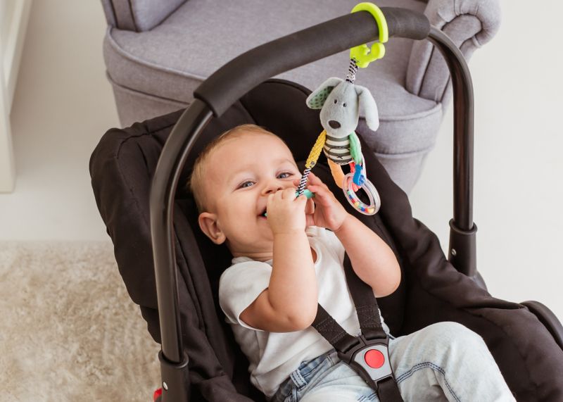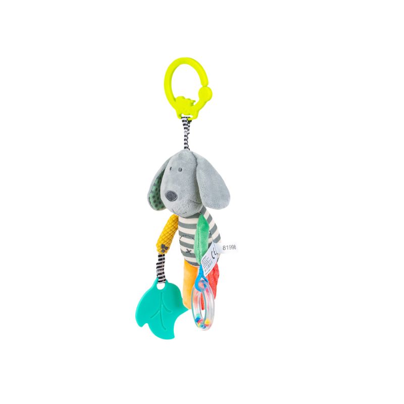Компактна висулка във формата на куче може да придружава бебето навсякъде, украсявайки столче за кола, количка или легло. Очарователното куче е изработено от материали с разнообразни шарки и текстури, благодарение на които стимулира сетивата на малкото дете, като влияе положително върху развитието на когнитивните му способности. Лапите на кучето са украсени с мека гризалка, която ще успокои възпалените венци и дрънкащ пръстен, пълен с цветни топки. Практичната дръжка, с която е оборудвана играчката, позволява лесното й закрепване навсякъде. Продуктът е предназначен за деца от раждането.
