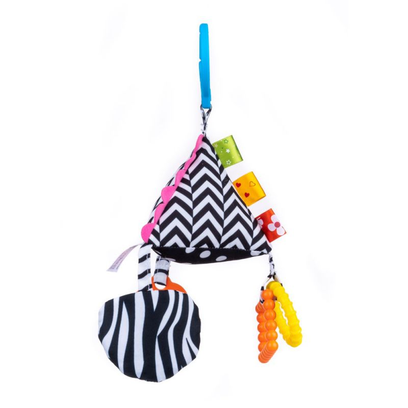 Характеристики: разноцветни етикети, контрастни шарки, гризалка, шумяща част, пластмасов ринг
