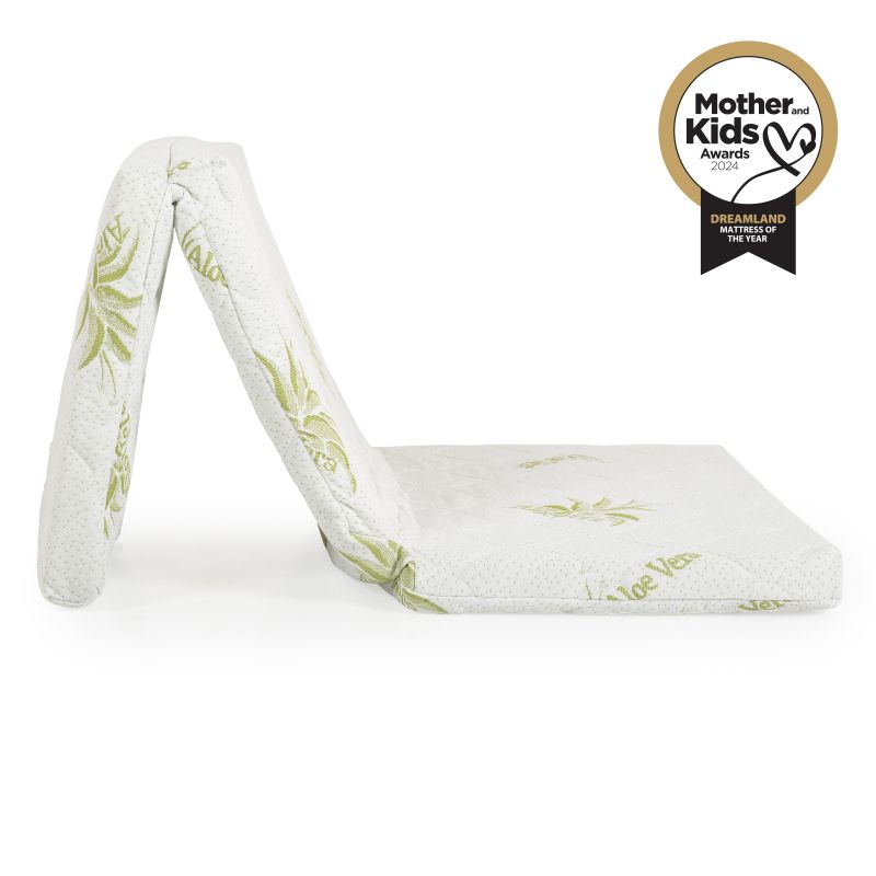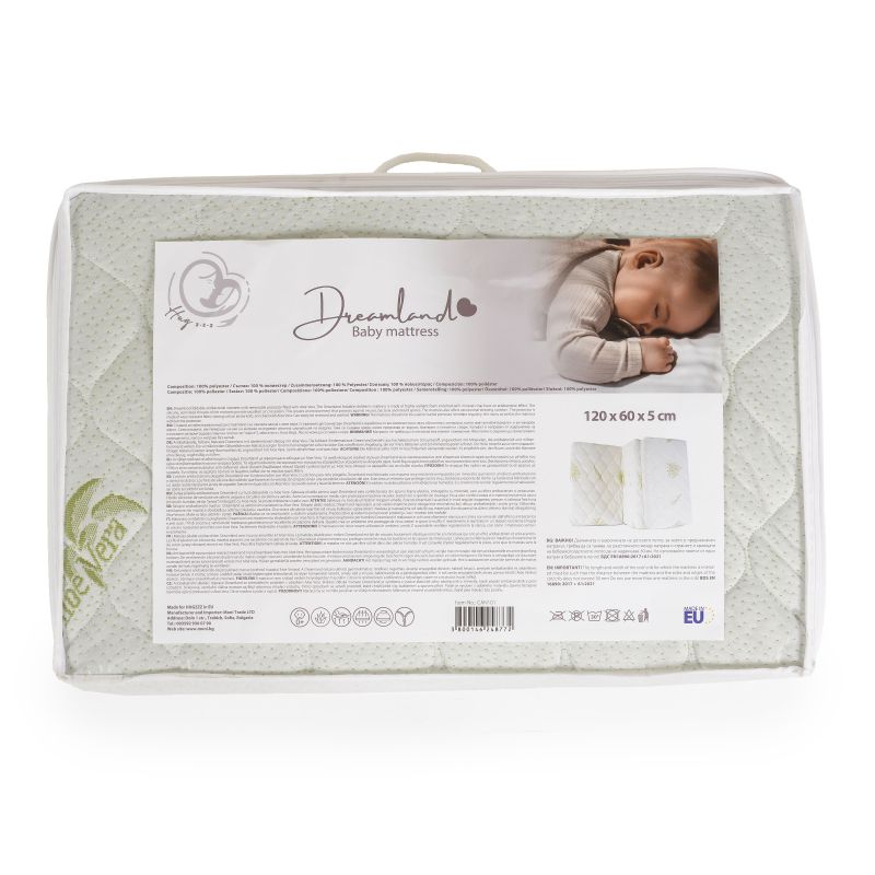 Сгъваем антибактериален матрак Dreamland със сваляем калъф с алое вера. Сгъваемият детски матрак Dreamland е изработен от високоеластична пяна, обогатена с минерали, които имат антибактериален и антиакарен ефект. Силиконовите, вентилиращи нишки на матрака осигуряват отлична циркулация на въздуха. Така се създава среда, която предпазва от вируси, бактерии и плесенни спори. Калъфът е направен от издръжлива на износване материя (здрава памучна плетка тип "жарсе".), обогатена с Алое Вера. Лесно може да се сваля и пере. ВНИМАНИЕ! Матракът не трябва да се изпозлва във влажни помещения. Желателно е редовно да проветрявате помещението, както и матрака без калъф.