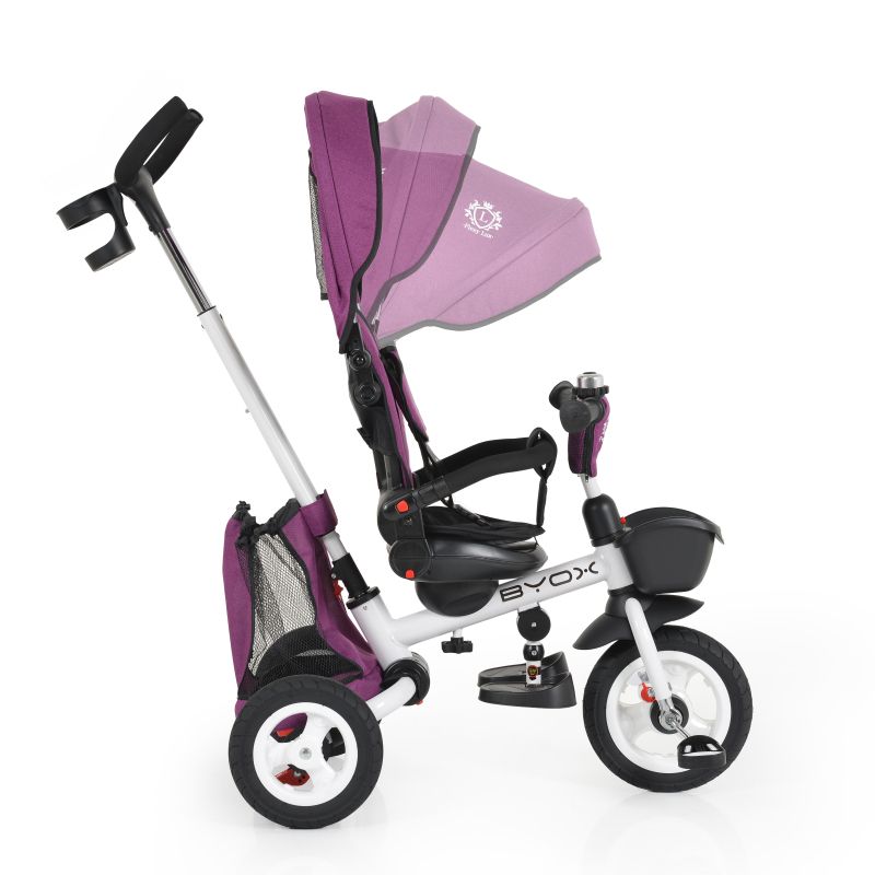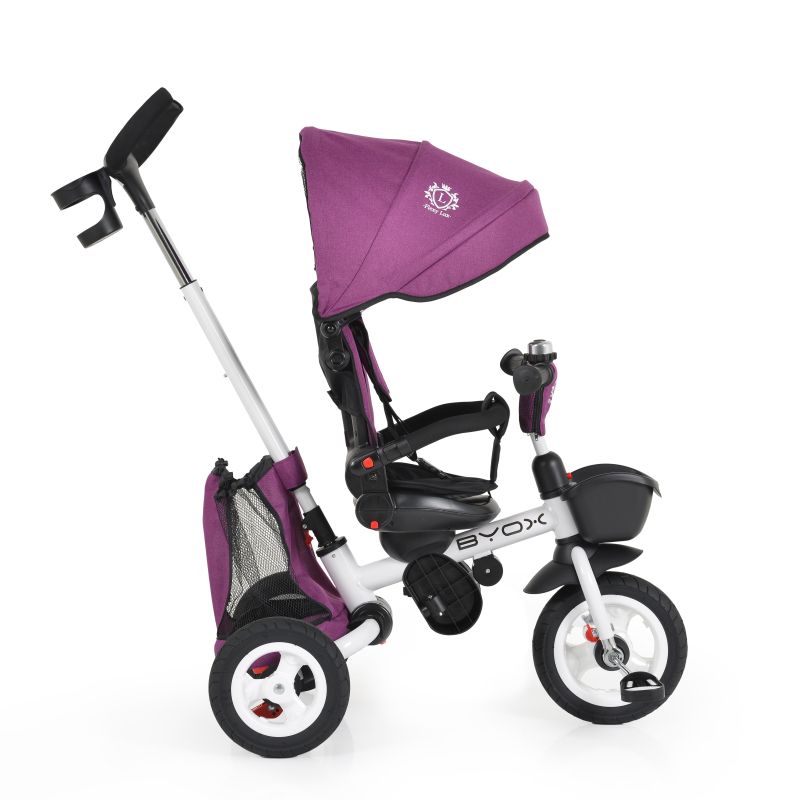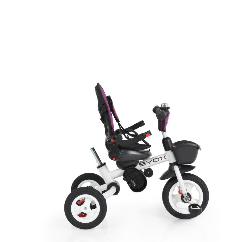 Функции:Предпазен колан 3-точков•Телескопична дръжка•Седалка въртяща се на 360°•Сваляща се тапицерия•Сваляща се дръжка•Регулируема облегалка•Поставка за чаша•Поставка за крака•Мека тапицерия•Кош преден за аксесоари•Звънец•Заключване на педалите•Дръжка с възможнос