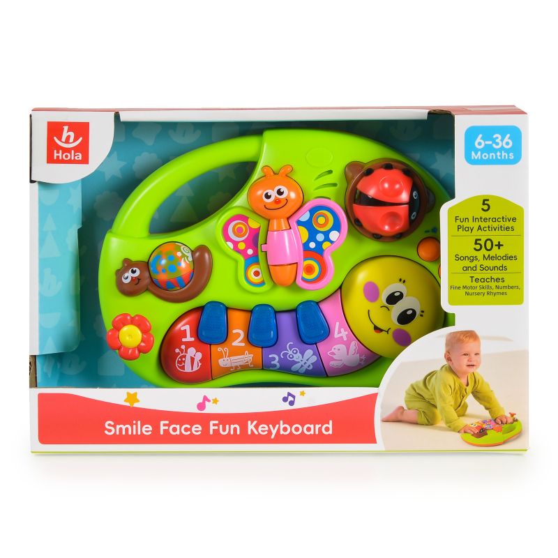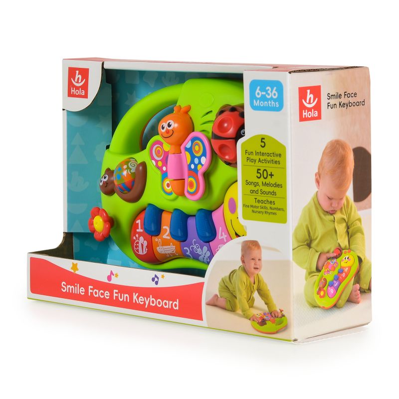 Въведете Вашето дете в света на музиката с това весело мини пиано! То разполага със светлинни и звукови ефекти, които стимулират музикалното възприятие и фината моторика на бебето. На пианото са оформени цветни фигурки като цвете, охлюв, пеперуда и калинка, които вдъхновяват различни движения—въртене, натискане и задържане. Играчката предлага два режима: нотен и стилов, както и регулиране на силата на звука.