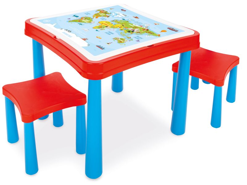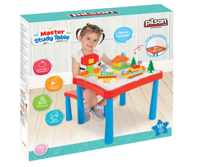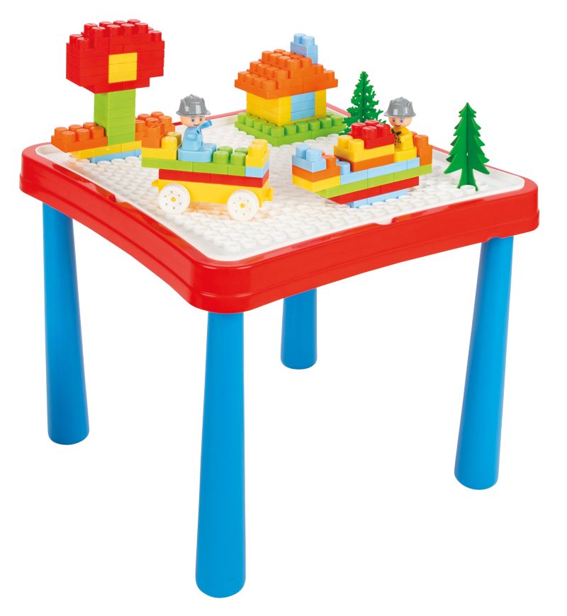 Маса с двулицева табла - едната страна е гладка, а другата релефна за подреждане на конструктор;