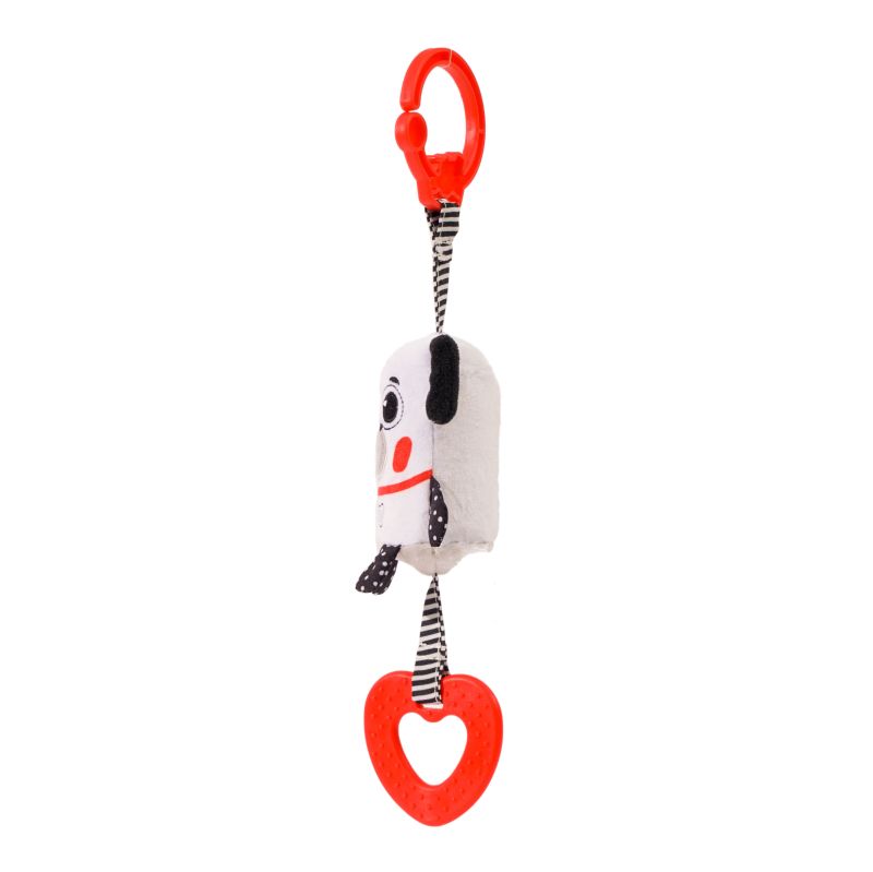 Меко и очарователно кученце, което издава весел звук при разклащане и привлича вниманието на бебето. Изработено от плюш, пластмаса и силикон, с разнообразни текстури за стимулиране на сетивата. Лесно се прикрепя към количка, креватче или столче за хранене с удобна закачалка. Подходящо за бебета от раждането.