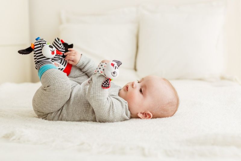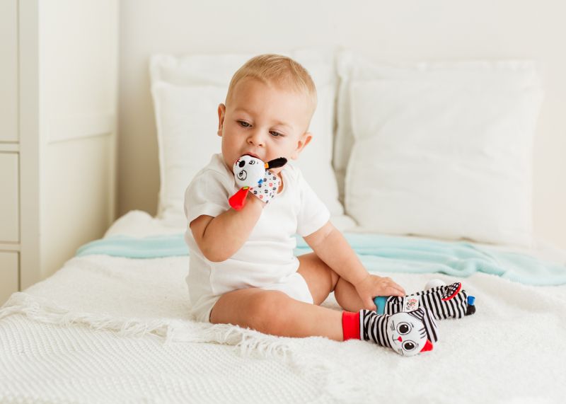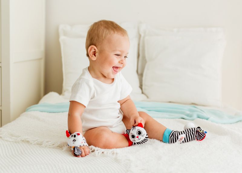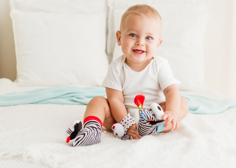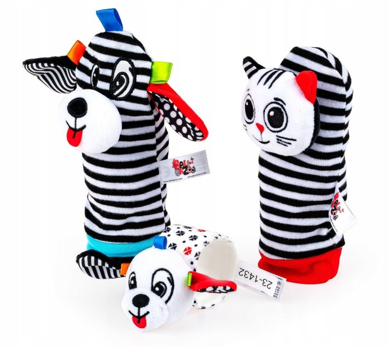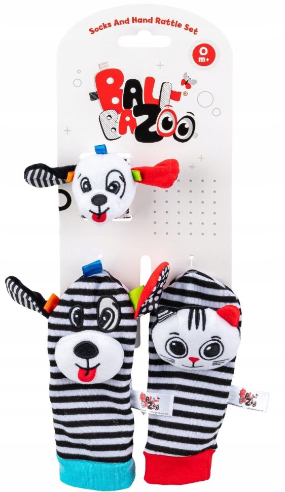 Дрънкащ екип от сладури ще развесели вашето бебе и ще го очарова с весели звуци! Комплектът включва два чорапа и гривна, украсена с глави на животни. Изработени са от материали в контрастни цветове и различни текстури, като по този начин стимулират сетивата на бебето, насърчавайки го да изследва света чрез сетивата. Комплектът може да се използва както комплект, така и всеки елемент поотделно, като изберете дрънкалката, към която бебето проявява най-голям интерес в даден момент. Продуктът е предназначен за деца от раждането.