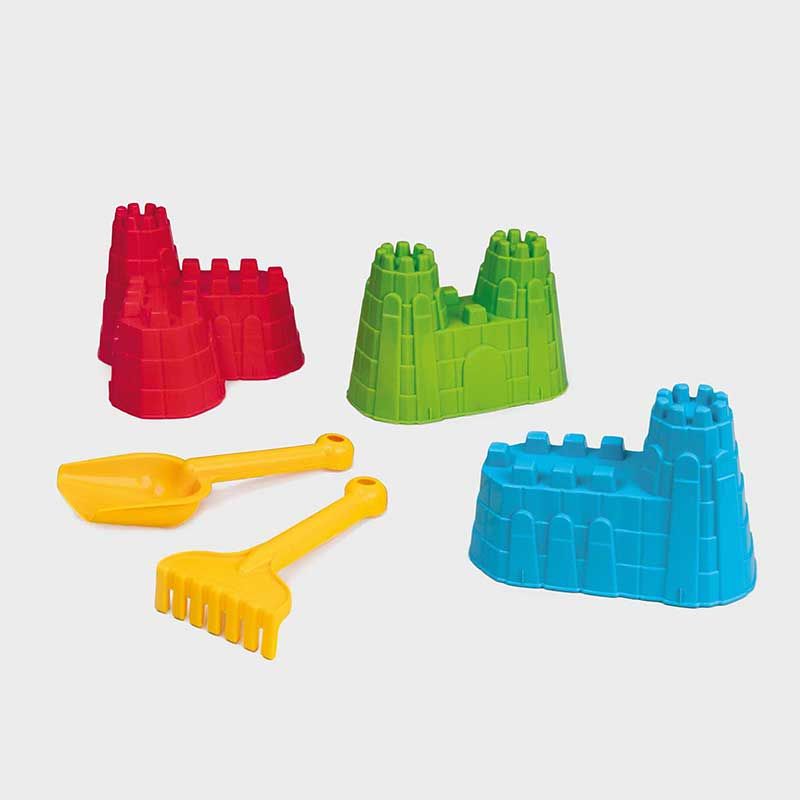 Детски мини комплект за пясък с три цветни формички на замък, гребло и лопатка. Предназначен за деца на 2 години, комплектът идва в опаковка с размери 15 x 21 x 15 см.
