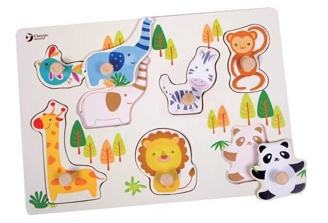 В пъзела ще намерите 7 дървени елемента с образа на различни животни - слон, зебра, майнума, панда, жираф, лъв и птичка. Те се различават както по големина, така и по форма. Краищата на животинките са заоблени, като по този начин се избягва рискът от нараняване. Всяка дървена фигурка е снабдена с малка дръжка, която улеснява захващането от малките детски ръчички. Частите на пъзела са изработени от дърво и са оцветени с безвредни бои на водна основа.