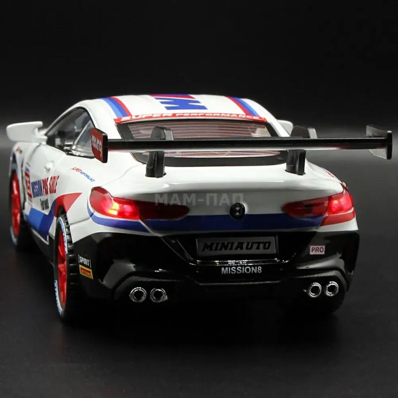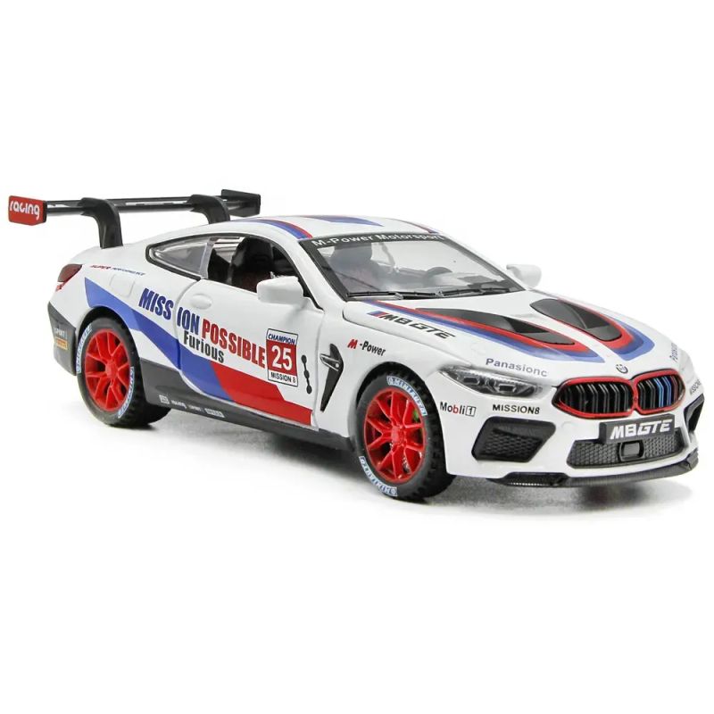 Този метален модел на BMW M8 GTE е създаден с внимание към детайла, за да пресъздаде динамиката и духа на състезателната писта. Играчката разполага с:
