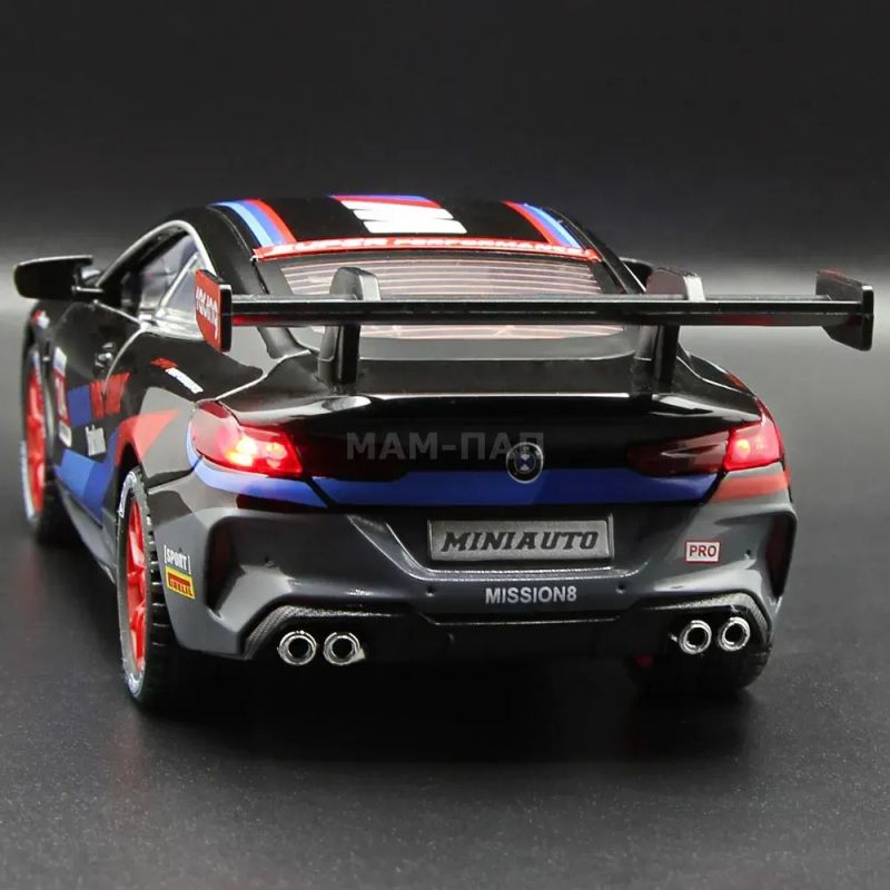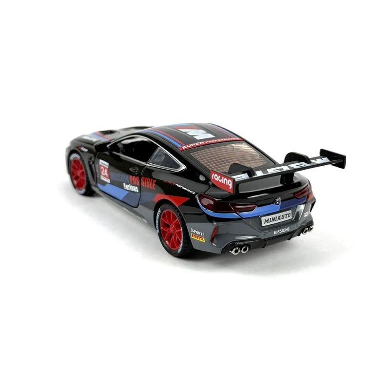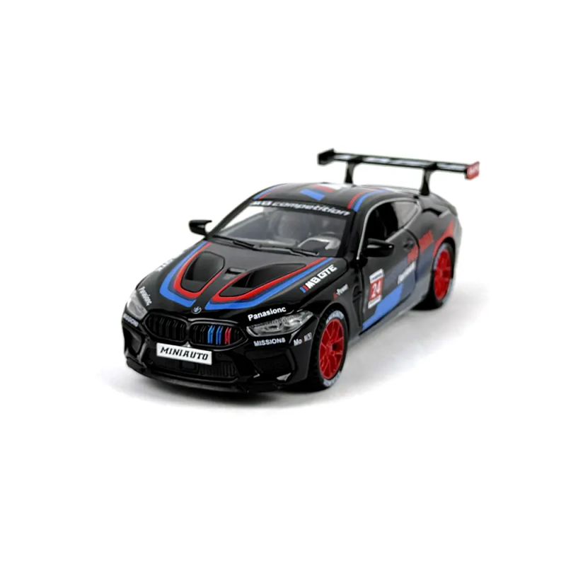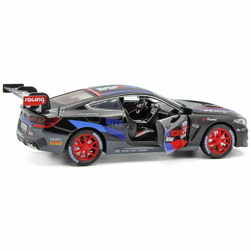Реалистичен метален модел на BMW M8 GTE в стилна черна разцветка с червени акценти. С отварящи се врати, светлини и звуци – идеален за колекционери и малки любители на състезанията.