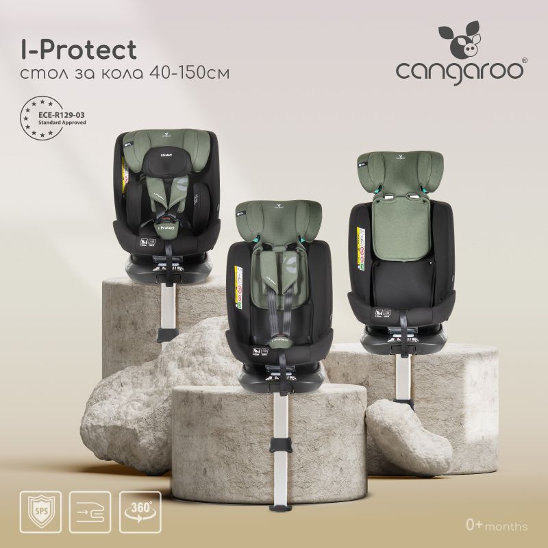 i-Protect, Cangaroo е високотехнологичен стол за кола, създаден с мисъл за безопасността и уюта на вашето дете, без компромиси. Подходящ за деца от 40 до 150 см, той предлага изключителна гъвкавост, интуитивен монтаж и първокласна защита при пътуване.