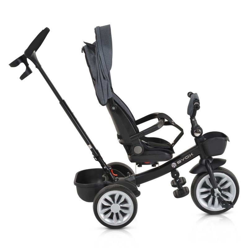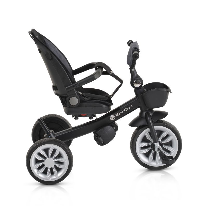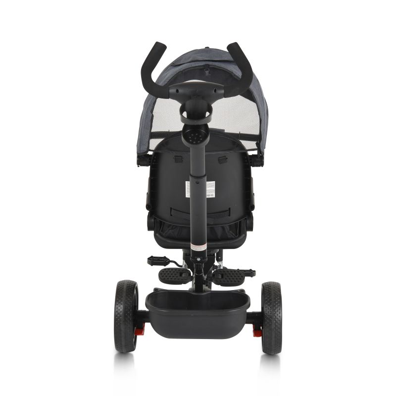 Седалката на триколката е оборудвана със седалка, която може да се върти на 360 градуса, и регулируема облегалка за гръбчето, които предлагат комфорт и подходяща поддръжка за детето. Регулируемата дръжка позволява на родителите да насочват посоката на движение на предното колело за по-лесно управление.