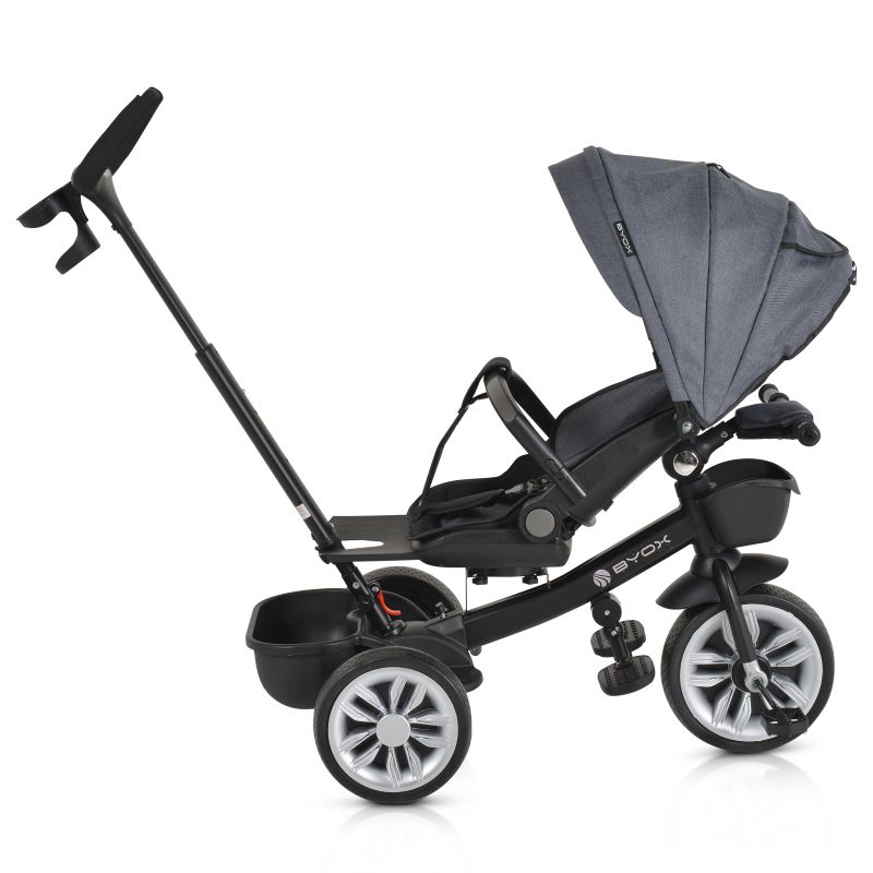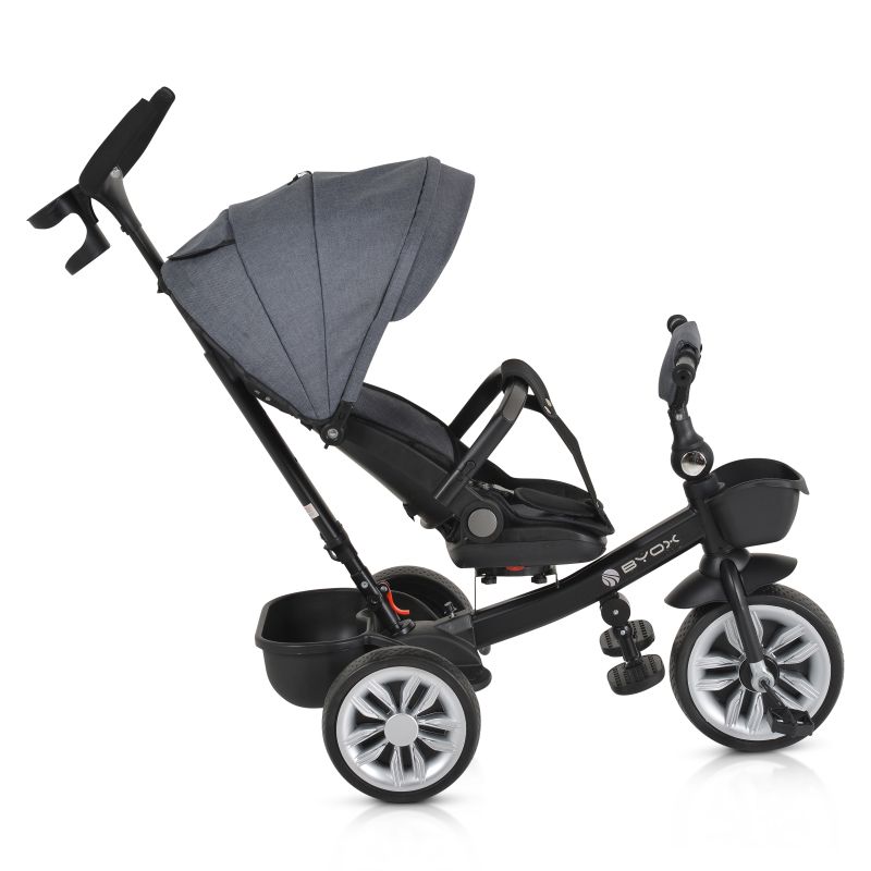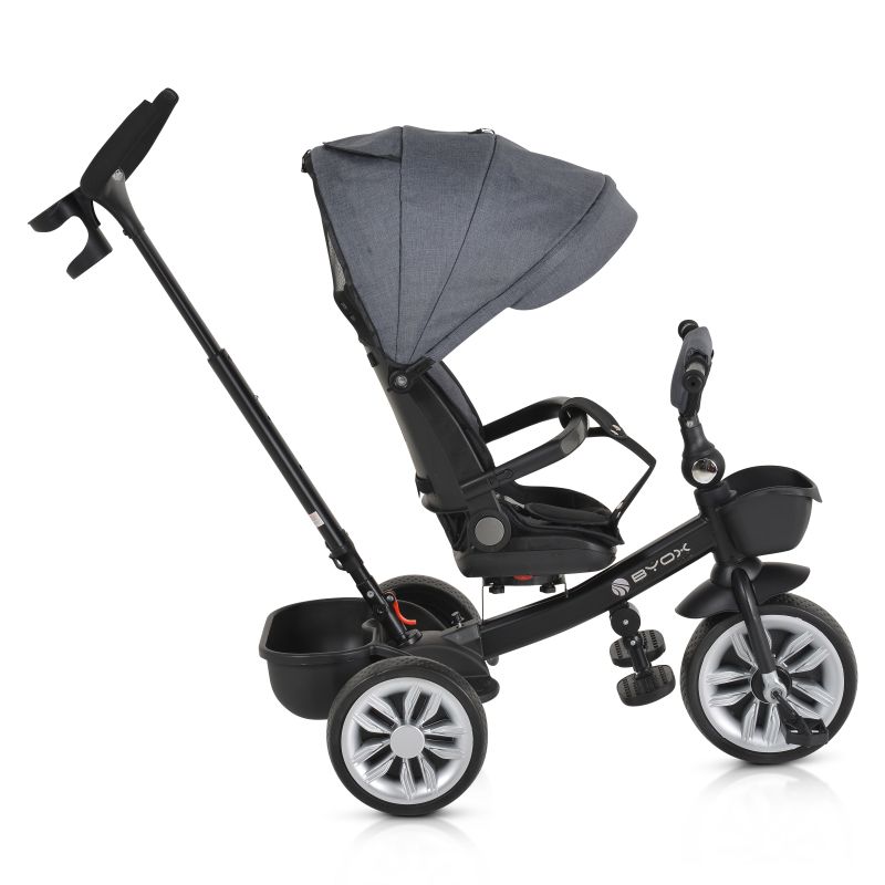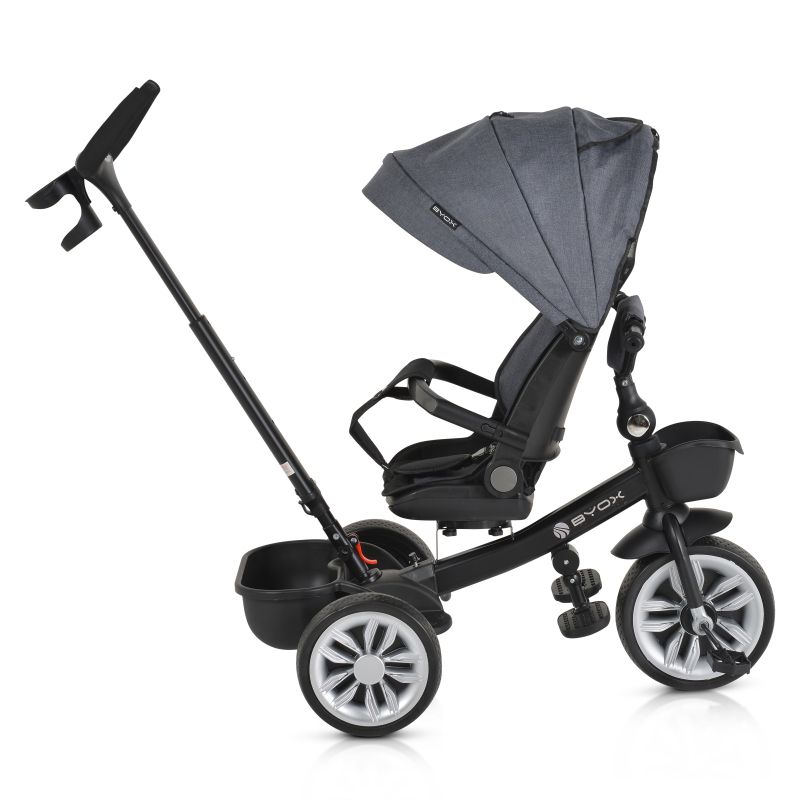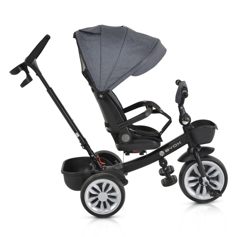 Триколката може да се използва както със сенника и предпазния борд, така и без тях, като се предоставя свобода на избор за родителите според предпочитанията им. Сгъваемото кормило осигурява удобство при съхранение и транспортиране на триколката.