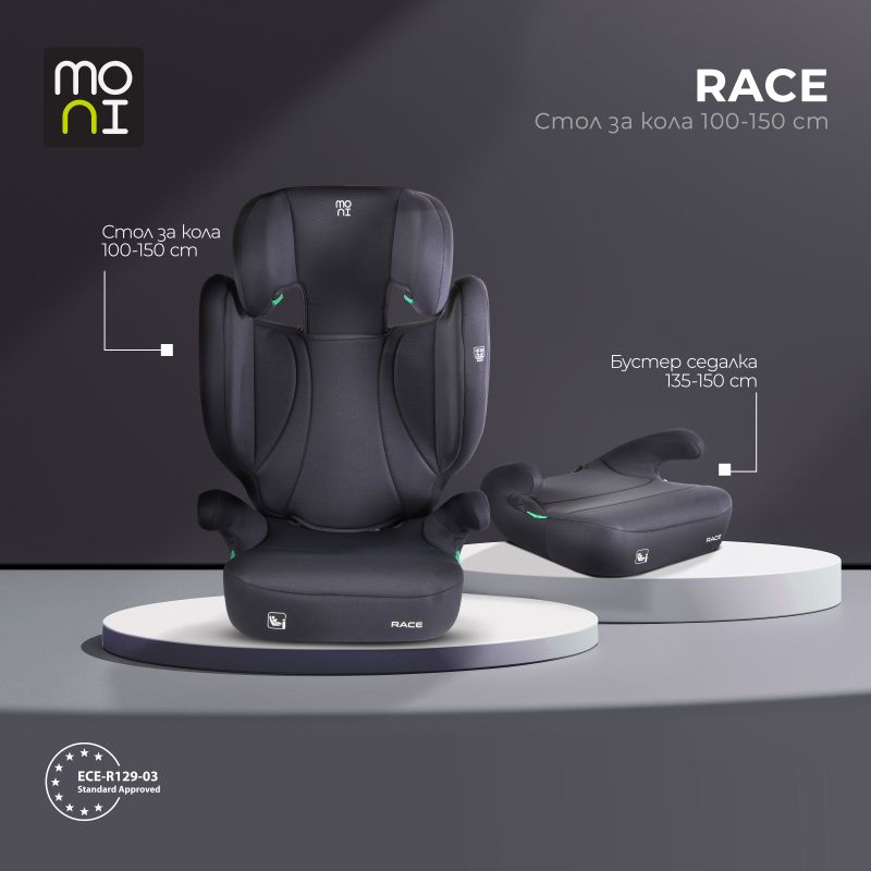 Столът за кола Race от Moni е предназначен за деца с височина от 100 до 150 см и е разработен съгласно най-новия стандарт за безопасност R129/i-Size. Създаден да расте заедно с детето, той предлага сигурност, функционалност и лесна трансформация от стол с облегалка в повдигаща седалка.