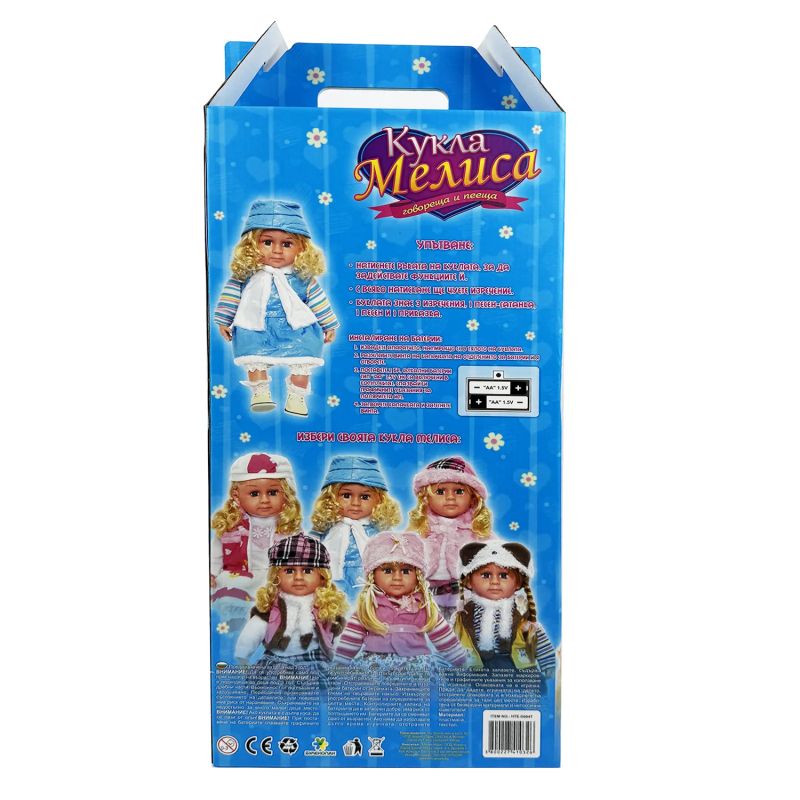 Куклата Мелиса е чудесен подарък за всяко дете, което обича ролевите игри и музиката. Висока около 50 см, тя е облечена в ярка червена жилетка и пъстра рокля с цветен десен, допълнени от бяла дантелена гарнитура. Червената лента за глава с декоративни елементи придава допълнителен чар. Куклата говори и пее на български език, като изпълнява весели песнички и фрази, които носят радост и развиват езиковите умения. Работи с 3 батерии тип "AA" (не са включени). Подходяща за деца над 3 години.