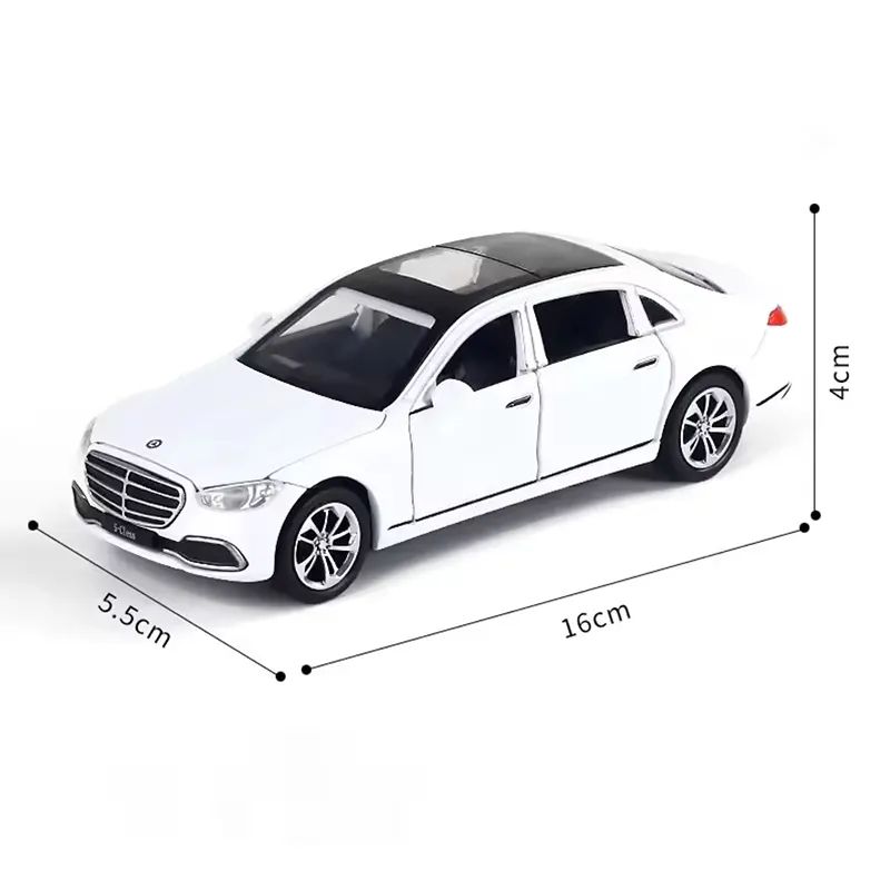 Насладете се на елегантността на Mercedes-Benz S-Class с този умален метален модел в бял цвят. Прецизно изработен от метал с пластмасови детайли, моделът разполага с отварящи се врати, стабилни гуми и изключително реалистичен дизайн. Подходящ е за игра, колекциониране или като стилен подарък за фенове на автомобилите.