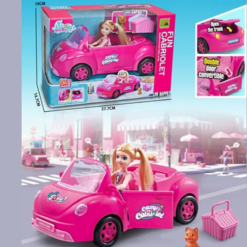 Очарователен комплект с кукла и стилен розов кабриолет. Колата има отварящи се врати и багажник, а към нея идват кошница и малко кученце – идеален подарък за всяко момиче!