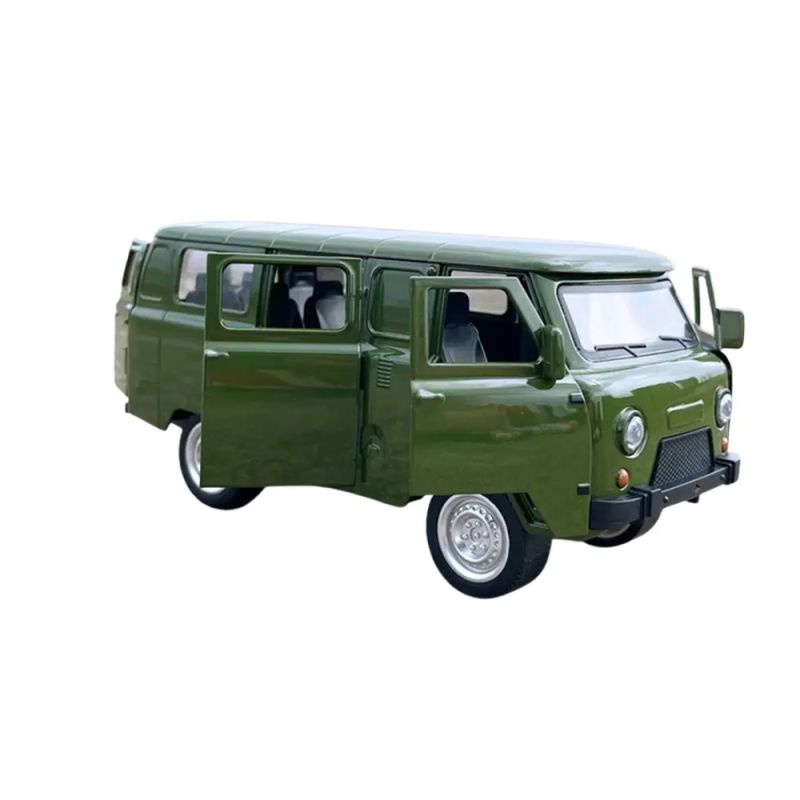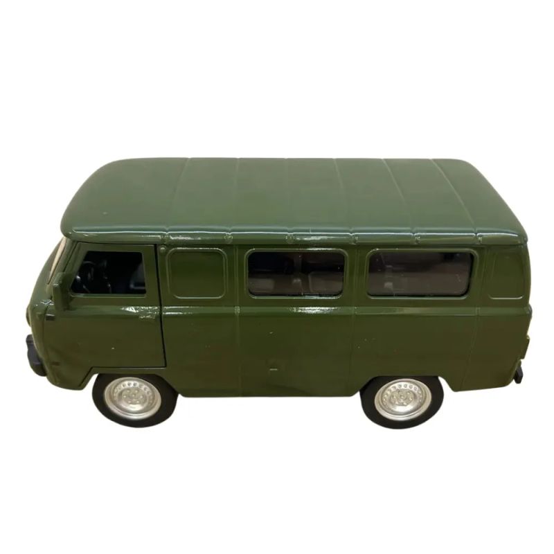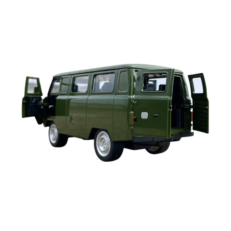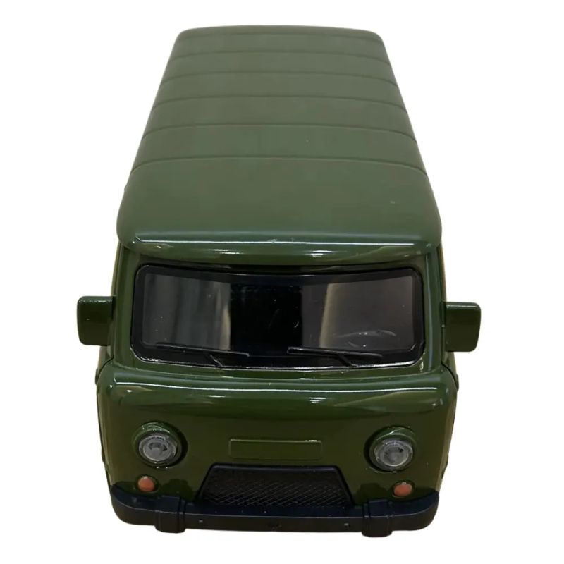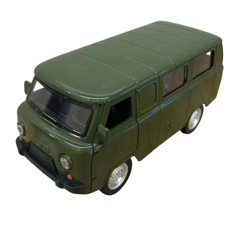 Този метален микробус UAZ в зелен цвят пресъздава емблематичния облик на класическия модел. Изработен с внимание към детайла, той разполага с инерционен механизъм, който осигурява плавно движение при засилване, както и отварящи се врати за по-реалистична игра.