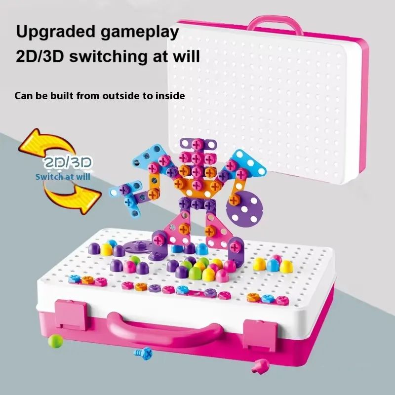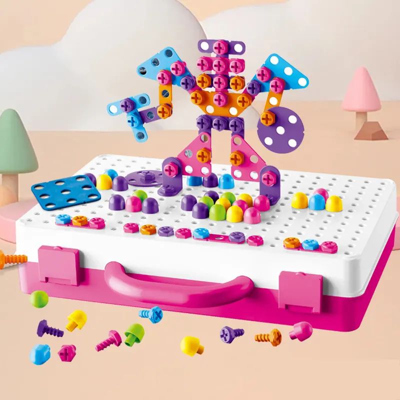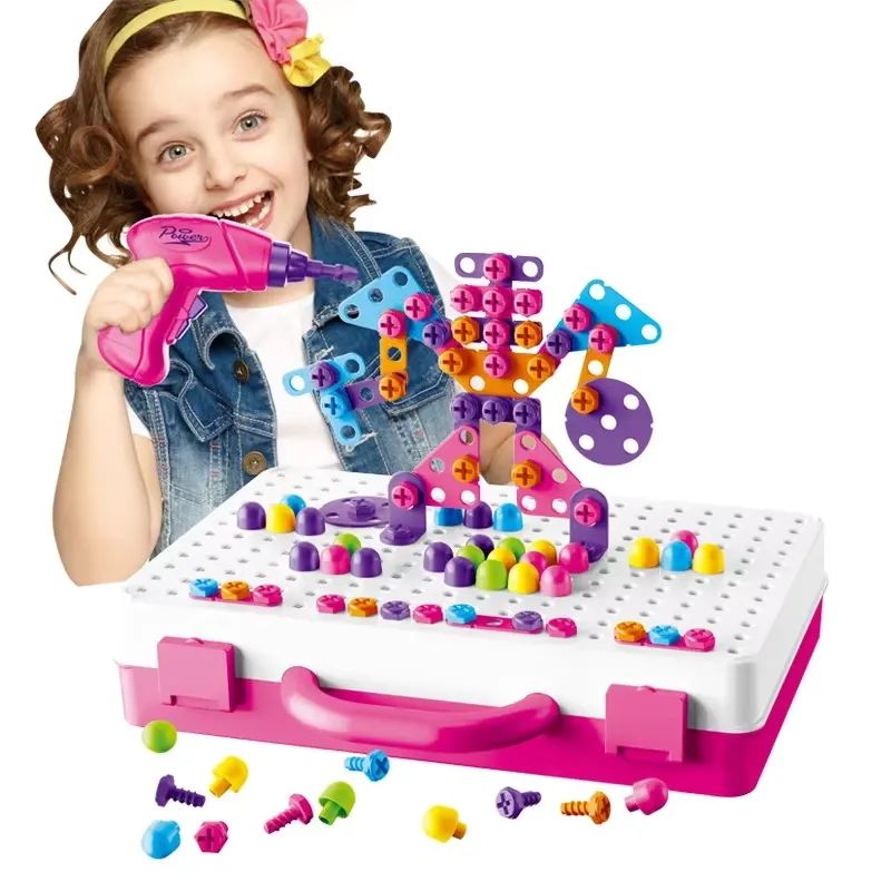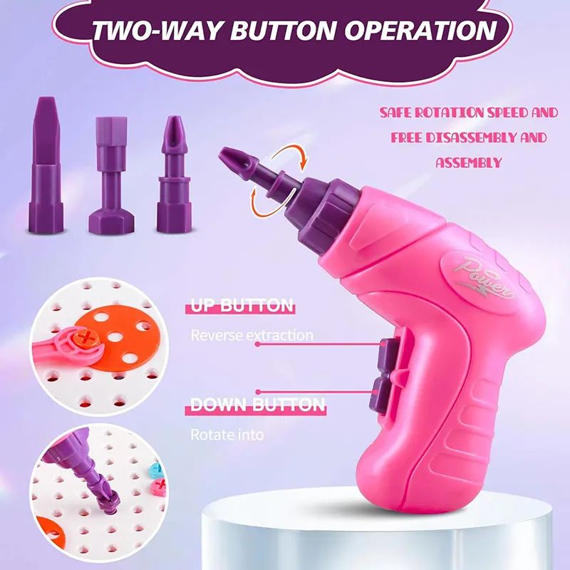 Образователен DIY конструктор с 249 части и електрически винтоверт. В розов куфар, идеален за малки творци. Развива креативността и фината моторика.