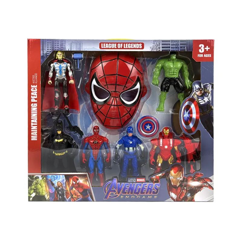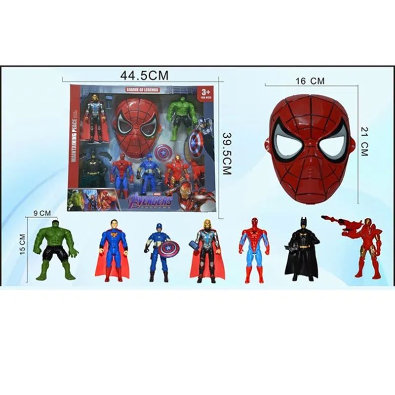 С този страхотен комплект малките фенове на супергероите ще могат да влязат в света на приключенията и героизма! В кутията са включени 7 фигурки на популярни герои – Спайдърмен, Батман, Супермен, Тор, Хълк, Капитан Америка и Айрънмен, както и маска на Спайдърмен. Всяка фигурка е изработена от висококачествена пластмаса, с подвижни крайници и ярки цветове. Маската е лека и удобна за носене – идеална за ролеви игри и костюмирани забавления.