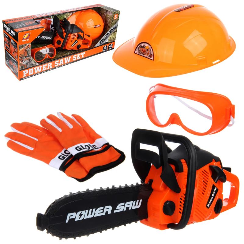 Детски комплект играчка-резачка със звук, защитна каска, очила и ръкавици. Идеален за ролеви игри „Майстор“.