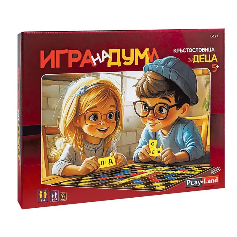 „Игра на думи“ е занимателна и образователна настолна игра, създадена специално за деца над 5 години. Тя пренася малките играчи в света на буквите и думите чрез кръстословичен принцип – всяка нова дума трябва да се допира, пресича или надгражда върху вече изградена комбинация.