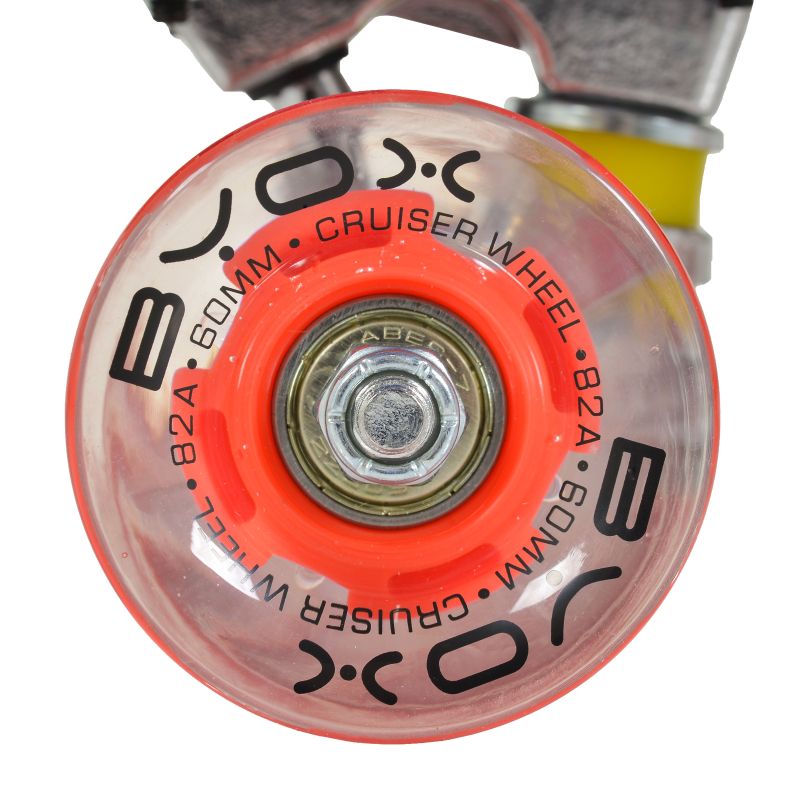 • Твърдост на колелата: 82A – перфектен баланс между сцепление и плавност
